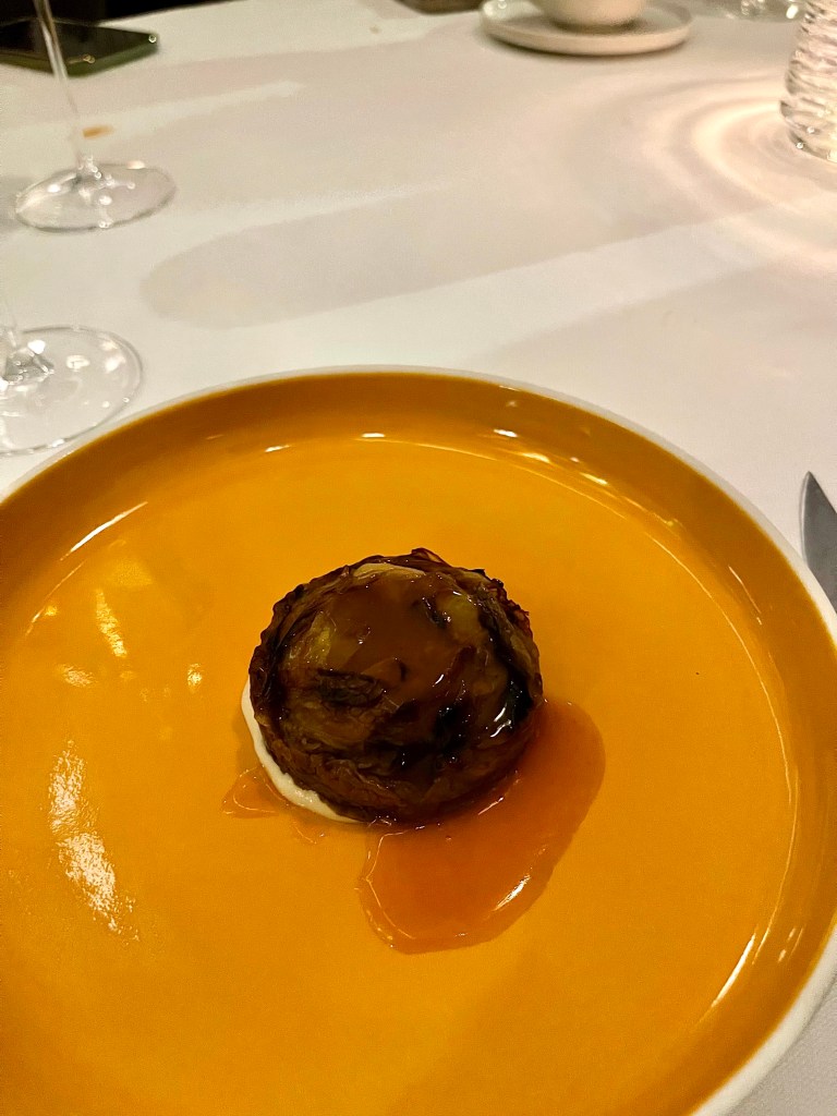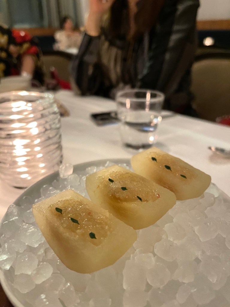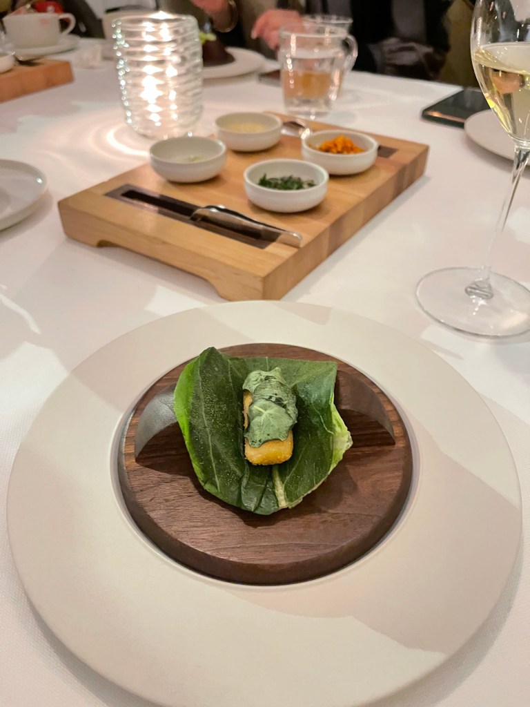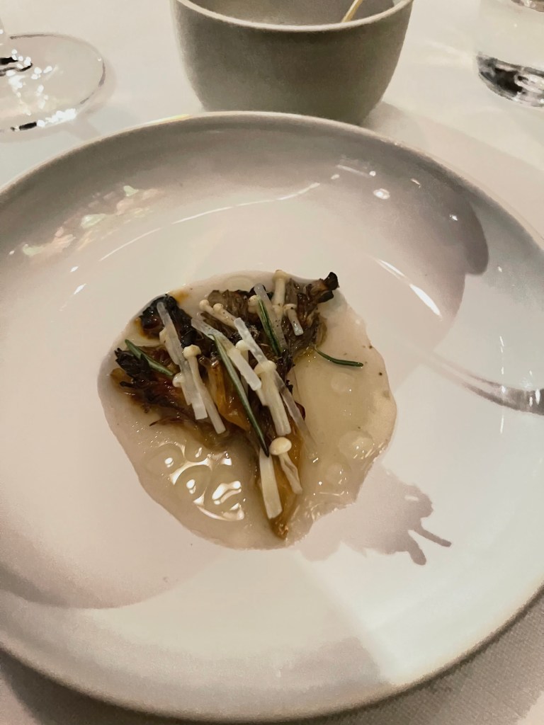 - Tonburi & Squash– This was the dish where we really saw Chef Daniel Humm’s vision for the future of the restaurant come together. There were many elements to this dish and the whole dish felt very nuanced and thoughtful. It wasn’t just mushroom or tofu cooked in a sauce (lol), there were layers of flavor to each element and together it created a very memorable bite. We thought it was interesting how in this dish especially there were many flavors from cuisines known for their vegetarian preparations. The dosa was a tribute to South Asian cuisine, and the Tonburi preparation was taught to the kitchen by famous Zen Buddhist chefs from Japan (according to our server). They were able to balance all these flavors in the dish to create a bite which felt elevated and interesting in flavor, which was impressive. We also liked that this dish was a tribute to New York lox & bagels (with Tonburi as caviar).