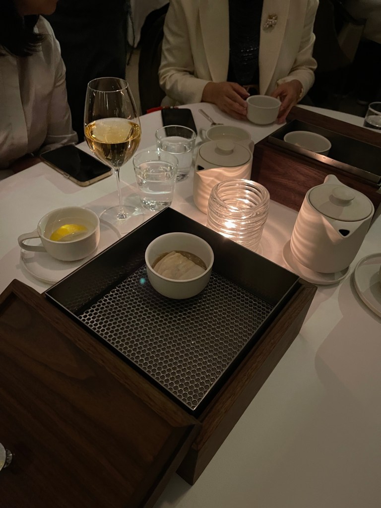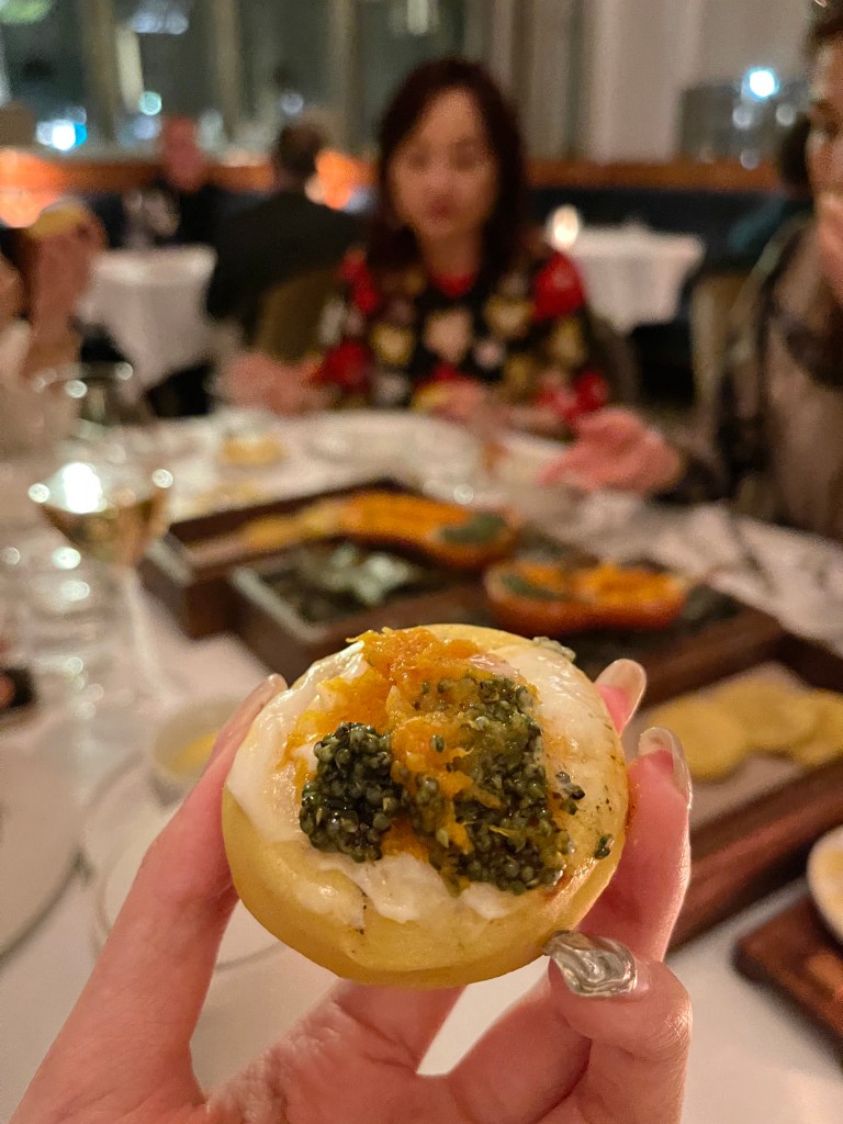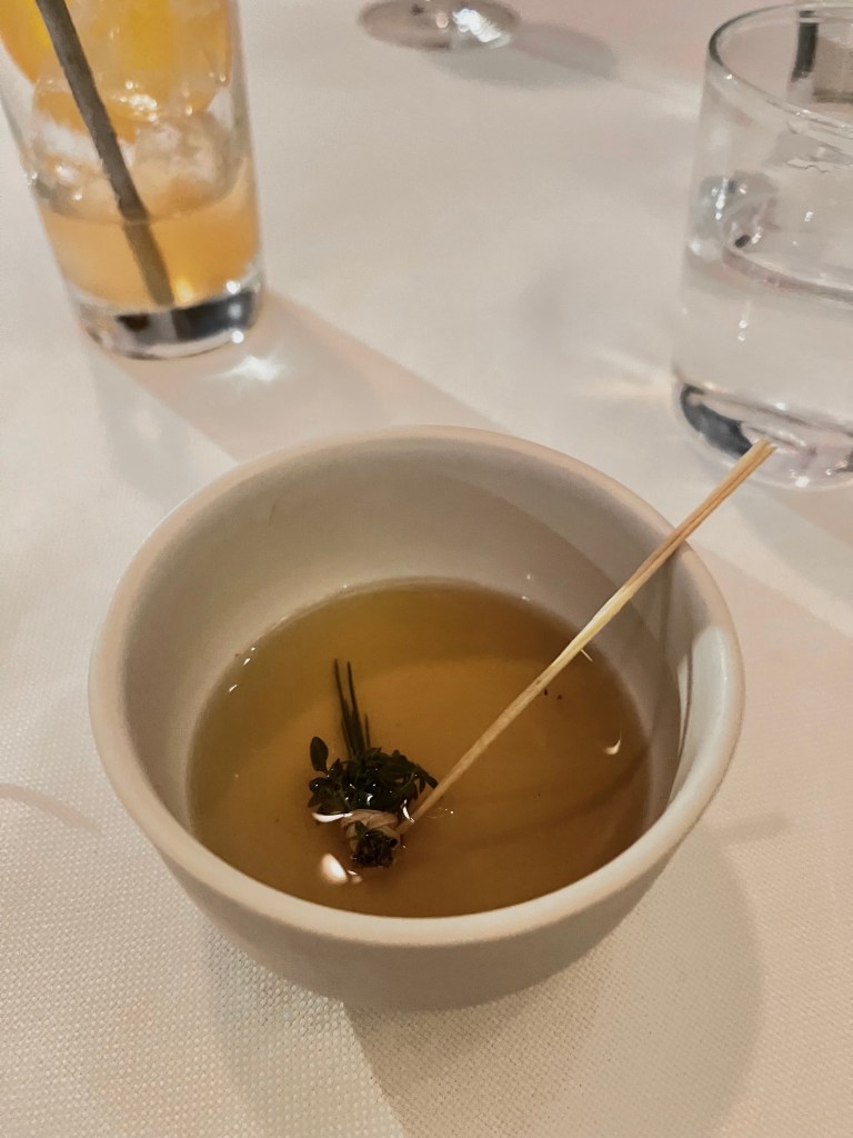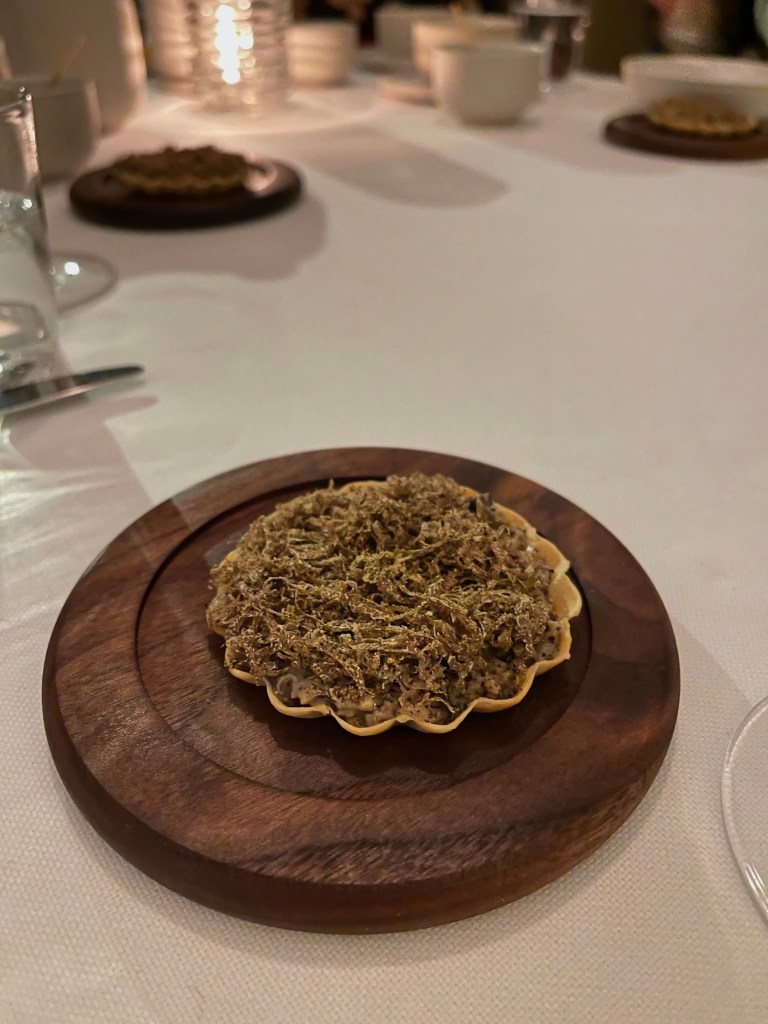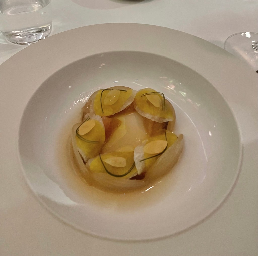 - Tonburi & Squash– This was the dish where we really saw Chef Daniel Humm’s vision for the future of the restaurant come together. There were many elements to this dish and the whole dish felt very nuanced and thoughtful. It wasn’t just mushroom or tofu cooked in a sauce (lol), there were layers of flavor to each element and together it created a very memorable bite. We thought it was interesting how in this dish especially there were many flavors from cuisines known for their vegetarian preparations. The dosa was a tribute to South Asian cuisine, and the Tonburi preparation was taught to the kitchen by famous Zen Buddhist chefs from Japan (according to our server). They were able to balance all these flavors in the dish to create a bite which felt elevated and interesting in flavor, which was impressive. We also liked that this dish was a tribute to New York lox & bagels (with Tonburi as caviar).