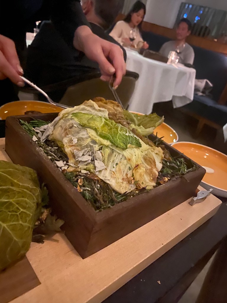 - Cabbage/ falafel dish– This dish was disappointing because of the expectation from the beautiful presentation. The dish arrived as a head of cabbage that the server had to wack apart with hammer. The outside seemed to be a cabbage shaped stone structure of some sorts that was able to hold in the heat so that the cabbage and the falafel inside was able to be smoked or cooked in a way. The main problem with this dish was quite simply, taste. For the dramatic entrance this dish created, the actual dish itself felt short. We were excited to try the falafel because we had read online that Chef Daniel Humm eats falafel everyday for lunch. The falafel would have been okay if not for the extremely salty sauce. The falafel itself was already salty but then with the added salt, it bordered on being inedible. Almost everyone in our party was unable to finish this dish. To be honest, the presentation and thought behind this dish really made us think that the direction that they were going in for vegan cuisine was great, but their execution still left much to be desired.